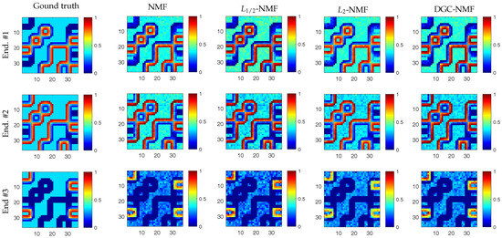 To present the effects of algorithms on the sparseness of unmixing results intuitively, we compare the sparseness histograms of different algorithms in Figure 5. The histogram are obtained by counting the sparseness levels of pixels’ abundance estimated by different algorithms. From the histogram in Figure 5b, it can be seen that the abundance result achieved by -NMF generally tends to be smoother. The histogram of -NMF owns more pixels with low sparseness levels compared to other algorithms. In Figure 5c, the whole histogram of -NMF has the tendency of a right shift, which demonstrates that -NMF can effectively promote sparsity in the unmixing process. The sparseness of pixels’ abundances will be raised when applying -NMF. The pixels with various sparseness are not able to receive constraints accommodated to their sparsity levels in -NMF and -NMF. For the histogram of DGC-NMF in Figure 5d, the right part of the histogram has the tendency towards a right shift and the left part has a tendency towards a left shift. This validates that the DGC-NMF algorithm can impose adaptive constraints on pixels according to their sparseness of abundances. Figure 6 shows the abundance maps of NMF, -NMF, -NMF, and DGC-NMF, respectively, when applied on synthetic data. It can be seen that DGC-NMF achieves sparser abundance results than NMF and -NMF in areas possessing high sparsity levels. Meanwhile, DGC-NMF obtains more accurate abundance results than -NMF in evenly mixed areas.