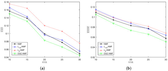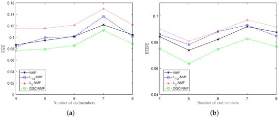 Experiment 3: The algorithms’ performance when the number of endmembers changes is presented in Figure 9a,b. The number of endmembers is set from 4 to 8 and the SNR is also set as 20 dB. Generally, DGC-NMF performs the best while -NMF performs the worst when the number of endmembers varies. For SAD, DGC-NMF still gains the best results, while -NMF performs the worst and -NMF and NMF have similar performance. From Figure 9b, we can see that DGC-NMF also achieves the lowest RMSE values when applied to data with different number of endmembers.