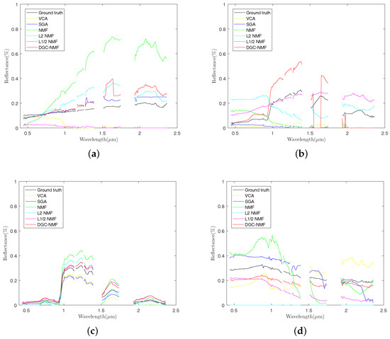 In Figure 12, the endmember signatures obtained by different methods are displayed with reference to the ground truth for visual comparison. It is shown that the endmember signatures obtained by DGC-NMF are in good accordance with the ground truth. Figure 13 shows the sparseness maps of abundance results obtained by -NMF, -NMF, and DGC-NMF, respectively. It can be seen that the sparseness values in the map of -NMF are low as a whole, while those of -NMF show relatively high levels. For the proposed DGC-NMF, the sparseness values are in better accordance with the distribution of ground covers in hyperspectral data. In high sparsity level areas such as the areas composed of asphalt, DGC-NMF acts in a similar manner to -NMF. In these areas, DGC-NMF promotes constraint and obtains sparser abundance results. In areas with low sparsity levels that are evenly mixed with signatures such as the areas with both trees and grass, DGC-NMF promotes constraint adaptively and obtains smoother abundance results of pixels. Therefore, the sparseness values are lower than those of -NMF, similar to -NMF. Figure 14 shows the separated abundance maps of each endmember by VCA-FCLS, SGA-FCLS, NMF, -NMF, -NMF, and DGC-NMF, respectively. As shown in the figure, all algorithms separate out the four targets successfully. Through visual comparison, we can see that -NMF and -NMF obtain smoother and sparser results than NMF, respectively. -NMF achieves great results in high sparsity level areas, but fails to capture mixed information in evenly mixed areas. The proposed DGC-NMF achieves sparser abundance maps than -NMF, and has better abundance estimation than -NMF in transition regions. Generally, Figure 13 and Figure 14 demonstrate that the proposed DGC-NMF could promote adaptive constraints on areas in hyperspectral images with various sparsity levels and achieve better unmixing results of abundance.