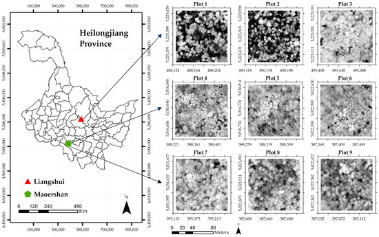 Study area II (Figure 1, Maoershan) is situated in the Maoershan Forest Farm, Shangzhi, Heilongjiang Province, China. Maoershan forest farm is geographically located in 127°30′–127°34′E, 45°21′–45°25′N. It is a typical natural secondary forests in the Northeast of China. The tree species mainly comprises Mongolia oak (Quercus mongolica), birch (Betula platyphylla), aspen (Populus davidiana), Hailar pine (Pinus sylvestris var. mongolica), Korean pine (Pinus koraiensis), larch (Larix gmelinii), and etc. Plots 4–6 and Plots 7–9 used in this study are conifer-deciduous mixed forests and deciduous forests, respectively (Figure 1).