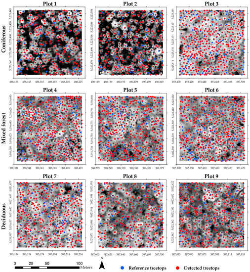 Detected treetops using the RHCSA algorithm for all nine plots, which was set to 0.85. The blue points represent reference treetops and the red points represent detected treetops.