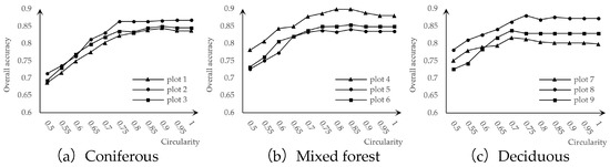 Another major parameter that affected the overall accuracy in the RHCSA algorithm was the circularity, which was applied for segmenting fusion regions in the iterative process. To further investigate the impact of circularity under different forest conditions, we adjusted the circularity threshold () from 0.5 to 1 with a step of 0.5 and analyzed the variation of overall accuracy in all plots. Figure 6 showed the impact of the circularity threshold on the overall accuracy of ITCD for three forest types. For coniferous forests, the overall accuracy increased rapidly with the increase of until reaching a sill, see Figure 6a. A small value tended to prevent fusion regions from further segmentation and resulted in more “merge” errors. Figure 6a illustrated that the with the highest overall accuracy for coniferous forests was about 0.9, which indicated that the crown of a conifer tree appears close to a circle [25]. Although the overall accuracy increased with the increase of for mixed and deciduous forests as well, the increase rates were not as high as that of coniferous forest. The that led to the peak values of the overall accuracy for mixed forest and deciduous forest were slightly lower than that for coniferous forest, that is, about 0.8–0.85 and 0.7–0.75, respectively (see Figure 6b,c). This is because that coniferous crowns are more circular than deciduous and mixed forests, while deciduous trees have larger and more irregular crowns. Although a higher could lead to higher accuracy in coniferous stands, the average circularity will decrease and a lower could obtain higher accuracy with the number of deciduous trees increased in a plot.