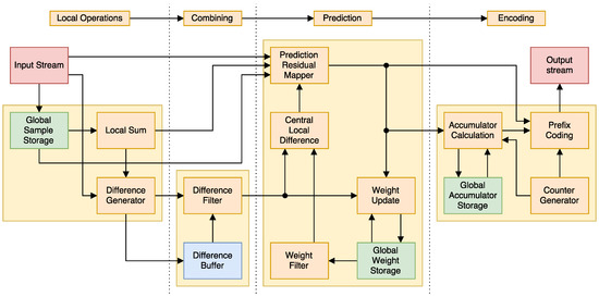 Our approach to the implementation has four major stages that can be seen in Figure 2: first, a series of local operations (that is, their results only depend on input samples and not on previous results) are performed. Second, previous results are mixed with the local ones. Third, the prediction is made using adaptive weights. Lastly, it is is encoded, using an accumulator this time to improve performance.
