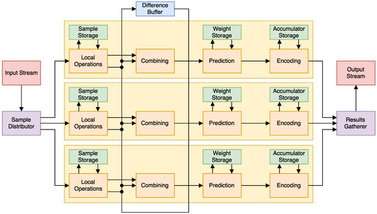 In order to parallelize the algorithm, we must take the dependencies into account. On top of the BIP restriction, the combining part of the algorithm for a sample might depend (if ) of the differences generated by the local operations part of previous samples . We can solve this issue by simply cabling the results of one band’s local operations to multiple combiners. We also keep a difference buffer for when the whole pixel is not processed at once. The full circuit can be seen in Figure 3.