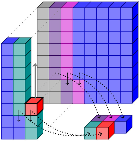 Queue chaining for Band Interleaved by Pixel (BIP) scan. Red is the current sample, and the rest of colors are different queues feeding into each other. The neighborhood is assembled from the first element of each queue.