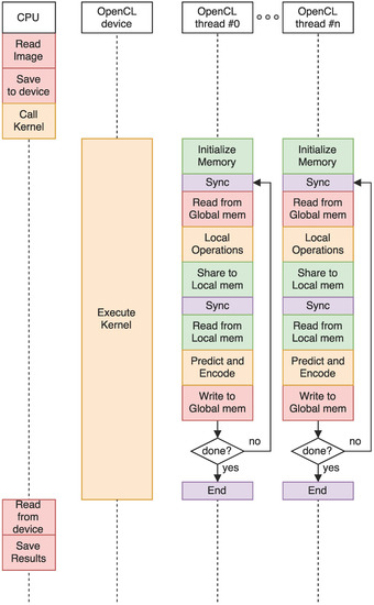 - These shared results are read from local memory, prediction and encoding are done, and the results are saved to global memory.