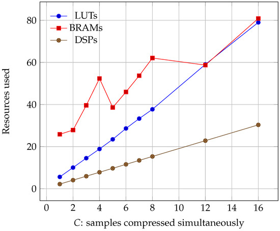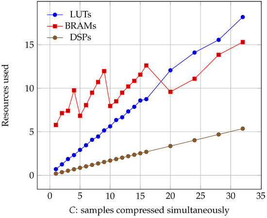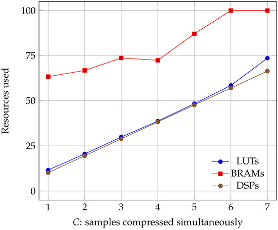 Percentage of the Virtex-7 resources used as the number of samples compressed simultaneously increased (lower is better).
