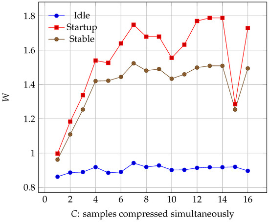 Virtex-7 power consumption as the number of simultaneously compressed samples increases. Note the stalling after when the design has reached real-time performance and keeps compressing at the same rate.
