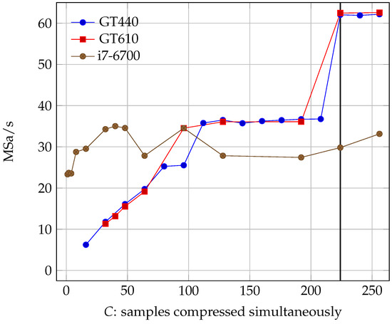 Kernel speed for different OpenCL devices. The black line shows the number of bands in AVIRIS’s images. Parallelizing beyond that point does not increase performance since, for a band, compression of a sample depends on results from the previous ones.