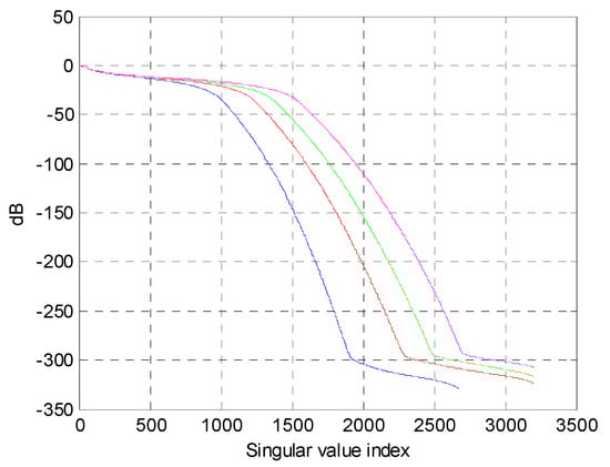 The singular values’ behaviours, relative to the four observation domains, are depicted in Figure 1. It can be noted that there is only a smooth increase in the significant number of singular values for the considered threshold values of TSVD in the reconstruction, and that the curve tends to “saturate”.