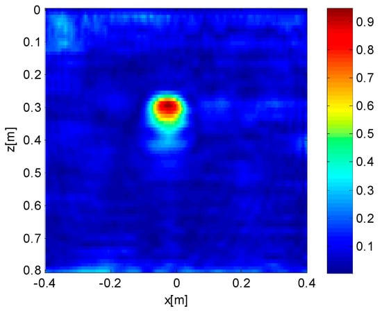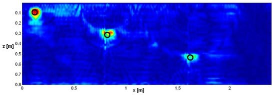 Finally, in Figure 13, the result of a migration performed on the same data of Figure 9 and Figure 10 is reported. Specifically, a Kirchhoff migration was performed on 41 traces, making use of the same relative permittivity (2.37) exploited for the inverse scattering results. The migration was performed by importing the synthetic time data into Reflexw (the previous elaborations were performed by means of homemade MATLAB routines). After migration, the data were re-imported into MATLAB and a time–depth conversion was performed for the representation. It can be seen that the effects of the ringing of the antennas and the effects of the background removal are more visible.