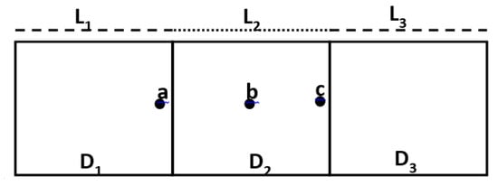 In the previous section, we showed that the most convenient choice for performing the inversion of a buried area is, in most cases (except for an electrically short observation line that is customarily of no practical interest), to adopt an investigation domain as large as the superposed observation line, and not shifted with respect to it. Consequently, in order to invert a long investigation domain, not viable for a “one-step” inversion, the most natural choice is to adopt subsequent adjacent investigation–observation domains along the radar profile, as schematically indicated in Figure 6. However, this introduces the problem of having targets that might be peripheral to the investigation domain wherein they are located, in particular, with regards to Figure 6 and the observation line (L2), target c is not seen under a symmetric maximum view angle (it is peripheral relative to the observation line, L2), whereas target a is able to cause artefacts in the investigation domain (D2), because it is quite probably perceived by the antennas when they pass the left edge of L2. We also clearly understand that the problem of the peripheral targets, and the problem of the interference for external targets, are two sides of the same coin. In particular, target a is peripheral to D1 and target c is a possible source of artefacts in D3. This last effect is essentially due to the fact that when adopting any fixed investigation domain, we are implicitly assuming that no target is present outside it, which does not correspond, in general, to the ground truth. These problems are clearly related to the performed subdivision into adjacent subdomains. In fact, neither a, nor c, are peripheral targets to the comprehensively gathered profile. The proposed scheme also encompasses the case of a target that crosses the edge between two adjacent domains; in fact, such a target can be ideally seen as a couple of adjacent targets—one on the left-hand side and one on the right-hand side of the edge.