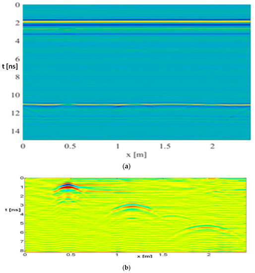 The classical way to achieve reliable and well-focused ground-penetrating radar (GPR) images is based on the migration procedure widely used and implemented in most available codes [,]. This data processing method originates from seismology [,,], and was later also adapted for the solution of inverse problems in Maxwell′s equations [,].