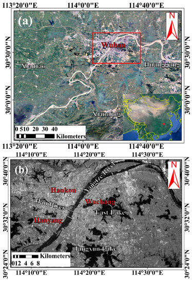 Wuhan is the central city of Central China. This city is located in the east of Jianghan Plain and southern slope of Ta-pieh Mountains (Figure 1a). Geographical coordinates of Wuhan include 113°41′–115°05′E and 29°58′–31°22′N. Yangtze and Han rivers pass through the central urban area of Wuhan and divide it into three main regions, i.e., Hankou (HK), Wuchang (WC), and Hanyang (HY). Many lakes (e.g., East Lake, Tangxun Lake, and Liangzi Lake) and rivers are distributed in Wuhan, in which water areas account for 25.79% of total area of the city. The study area is outlined by red rectangle in Figure 1a, covering most of Wuhan City. Figure 1b shows SAR mean intensity map of the Sentinel-1A, the map covers the study area. Length of mean intensity map in east–west and south–north directions measures approximately 46.62 and 34.22 km, respectively.