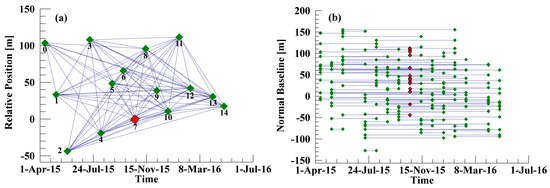 (a) Time–position of Sentinel-1A image interferometric pairs; and (b) time–baseline of Sentinel-1A image interferometric pairs. The red diamond denotes the super master image. Blue lines represent interferometric pairs. Green diamonds denote slave images.