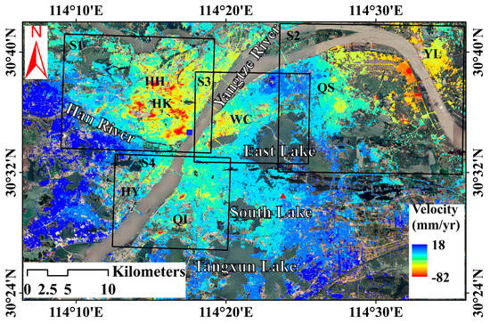 Vertical deformation rates derived by SBAS InSAR for the whole study area during the period from 11 April 2015 to 29 April 2016. The background is a Google Earth image acquired in 2016. Red triangle and blue square denote locations of reference point and Hankou hydrological station, respectively. Regions S1–S4 marked with black rectangles are major subsidence areas in Wuhan. These areas will be further analyzed in the discussion section. HK, HH, WC, QS, YL, HY, and QL are the abbreviations of Hankou, Houhu, Wuchang, Qingshan, Yangluo, Hanyang, and Qingling, respectively.