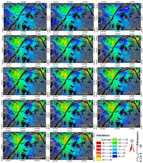 Cumulative subsidence (in the vertical direction) time series from 2015 to 2016. The image acquired on 11 April 2015 was not shown because it was selected as a reference image. The background is Sentinel-1A TOPS mean intensity image of Wuhan. (a–n) Cumulative subsidence in 14 stages in Wuhan. (a) 11 April 2015–5 May 2015; (b) 11 April 2015–29 May 2015; (c) 11 April 2015–16 July 2015; (d) 11 April 2015–9 August 2015; (e) 11 April 2015–2 September 2015; (f) 11 April 2015–26 September 2015; (g) 11 April 2015–20 October 2015; (h) 11 April 2015–13 November 2015; (i) 11 April 2015–7 December 2015; (j) 11 April 2015–31 December 2015; (k) 11 April 2015–24 January 2016; (l) 11 April 2015–17 February 2016; (m) 11 April 2015–5 April 2016; (n) 11 April 2015–29 April 2016. HH region in HK is marked by black rectangle in (n).