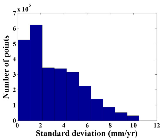 To assess internal precision of subsidence rates extracted from Sentinel-1A TOPS data by SBAS InSAR technique, standard deviations of subsidence rates were statistically analyzed. Figure 5 shows distributions of standard deviations of subsidence rates. The standard deviations were obtained by computing the deviations of the linear fitting of velocities. If a PS point shows a strong nonlinear motion, it resulted in a large residual with respect to the linear model, i.e., in a high standard deviation value. Standard deviation of SBAS InSAR-derived results using Sentinel-1A TOPS data is 3 mm/year. Maximum standard deviation of PS point reaches 11 mm/year, and standard deviations of subsidence rates of 86.27% PS points are less than 6 mm/year. According to the above analysis, surface subsidence derived by SBAS InSAR technique using Sentinel-1A TOPS data features high reliability and precision.