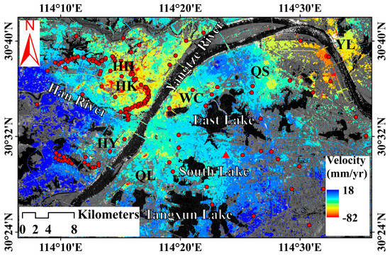 Figure 3 shows the subsidence rate map derived using SBAS InSAR; the map is superimposed on the Google Earth image of Wuhan acquired in 2016. Based on collected leveling data, a stable point located at 30°30′25′′N and 114°22′44′′E (red triangle in Figure 3) was selected as reference point, and subsidence rates in the study area were considered based on the reference point. Positive values of rate map indicate that the surface is uplifting in the vertical direction, whereas negative values denote surface subsidence in the vertical direction. Total number of PS points extracted from Sentinel-1A TOPS dataset by SBAS InSAR technique reached 2,101,453. Average density of PS points in the study area totaled 1317 PS points/km2. SBAS InSAR-derived results in Figure 3 reveal that annual average subsidence rates in Wuhan range from −82 mm/year to 18 mm/year, and the largest subsidence rate was detected in HH region, Hangkou District (HK).