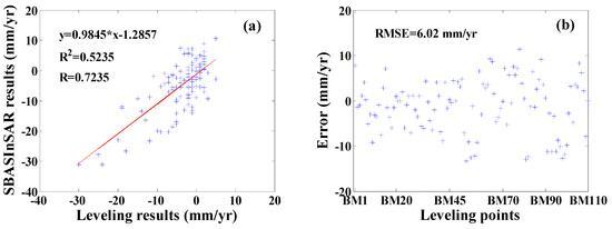 (a) Regression analysis between surface vertical deformation rates derived by SBAS InSAR and leveling; and (b) differences between SBAS InSAR- and leveling-derived results.