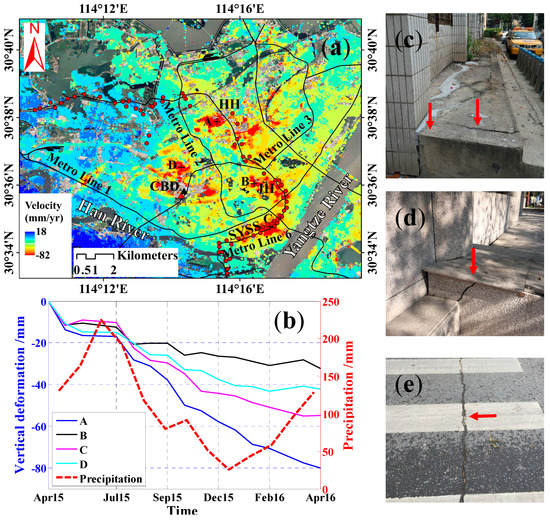 Surface vertical deformation rate map derived by SBAS InSAR superimposed on Google Earth image covering (a) Region S1. Black lines denote Wuhan Metro Lines, including metro lines in operation and under construction. Red circles represent leveling points distributed along Metro Line 6, which is under construction. Black and red triangles denote Wuhan Center and Wuhan World Trade Center, respectively. (b) Surface subsidence (in the vertical direction) time series with respect to PS points (marked by black crosses in Figure 8a) labeled as A, B, C, and D in Figure 8a versus average monthly precipitation of Wuhan area. (c–e) Structural damage caused by surface subsidence.