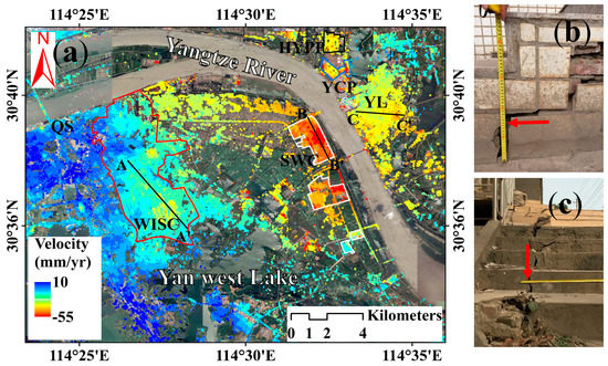 Surface vertical deformation rate map superimposed on Google Earth image covering (a) Region S2. Red, white, blue and black polygons denote the industrial areas of WISC, SWC, YCP, and HYPP, respectively. Black lines represent subsidence profiles that will be further analyzed in the Section 5.3. (b,c) Structural damage due to surface subsidence.