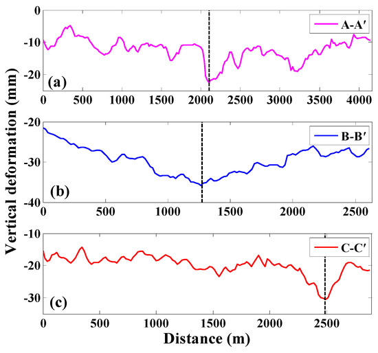 (a–c) Variation in accumulated subsidence (in the vertical direction) during the period from 11 April 2015 to 29 April 2016 along profiles A-A′, B-B′, and C-C′ (in Figure 10). Black dotted lines mark locations of the largest accumulated subsidence of profiles.