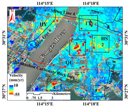 Surface vertical deformation rates map derived by SBAS InSAR superimposed on Google Earth image covering Region S4. Black lines denote the Wuhan Metro Lines, including metro lines in operation and under construction. The area enclosed by red line represents the Baishazhou Carbonate Rock belt. The red square denotes karst surface collapse. Areas 1, 2, 3, 4, and 5 marked with black rectangles are significant subsidence areas in Region S4.