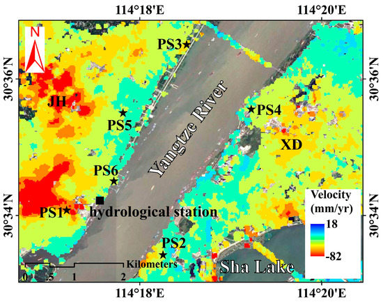 Surface vertical deformation rate map superimposed on Google Earth image covering both sides of the Yangtze River. The black square and five-pointed star denote the Hankou hydrological station and PS point, respectively. JH and XD are the abbreviations of Jianghan and Xudong, respectively.