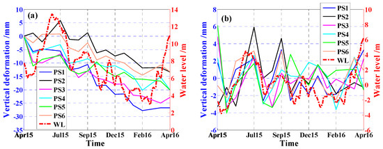 As illustrated in Figure 14a, water level changes in Yangtze River exhibit obvious seasonal variability during the study period. Water level was typically high from May to July but low from January to March. On the other side, surface subsidence time series of the six PS points also showed a nonlinear decline with seasonal oscillation. Water level was high from May to July, and subsidence was low because of high water level in Yangtze River during this period. These conditions can effectively replenish groundwater and mitigate surface subsidence. From July 2015 to March 2016, water level dropped by 9 m, and average accumulated subsidence of six PS points reached approximately −19 mm.