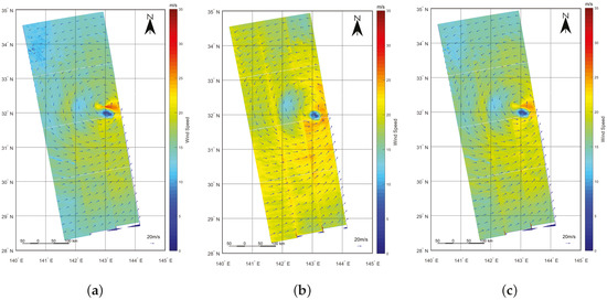 SAR wind field of satellite Sentinel-1 in the typhoon “Lionrock” region with a resolution of 500 m (the arrows here are thinned for clarity): (a) retrieved wind using VV polarization observation; (b) retrieved wind using VH polarization observation; (c) synthetic wind combined with VV and VH polarization retrieved wind.