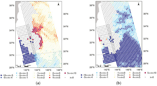 In this study, we select typhoon Lionrock (2016) as a numerical example, which was generated in the Northwest Pacific at 2000 UTC 19 August 2016, in the vicinity of (33.1° N, 141.4° E). The center’s maximum wind speed was about 18 m·s, and its pressure was about 994 hPa. Lionrock weakened to an extratropical cyclone on 31 August. The the Weather Research and Forecasting model data assimilation system (WRFDA) developed by the National Center for Atmospheric Research (NCAR) [40] is adopted in this study. The WRFDA system is a widely-used operational system that can produce a multivariate incremental analysis in the WRF model space [41]. The grid size of the assimilation region is ; the horizontal resolution is 15 km; and the vertical discretization is 30 layers. The time of assimilation is based on the time window of the joint wind field of the typhoon region, which was 0900 UTC 29 August 2016. The NCEP FNL (Final) Operational Global Analysis data are used as the initial field and boundary conditions. This product is on one-degree by one-degree grids prepared operationally every six hours. It is from the Global Data Assimilation System (GDAS), which continuously collects observational data from the Global Telecommunications System (GTS) and other sources, for many analyses. We take the 21-h forecast adjustment from 1200 UTC 28 August 2016 to 0900 UTC 29 August 2016 as the background field of the assimilation system. After the assimilation, a 30-h forecast is made, which is a forecast to 1500 UTC 30 August 2016.