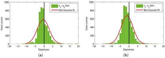 Best Gaussian fit to the observation deviation distribution: (a) u component; (b) v component.