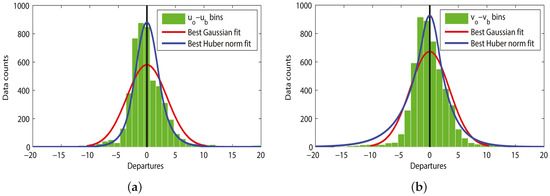 Best Huber norm fit to the observation deviation distribution: (a) u component; (b) v component.