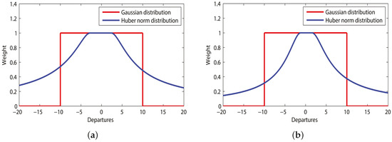 Figure 7 shows the weight assigned to observation using the Gaussian distribution QC scheme and the Huber norm distribution QC scheme. As shown in the figure, the observation whose deviation drops between the two transition points is given equal weight, while the weight of others is reduced by the ratio of to its cost function under the Gaussian assumption.