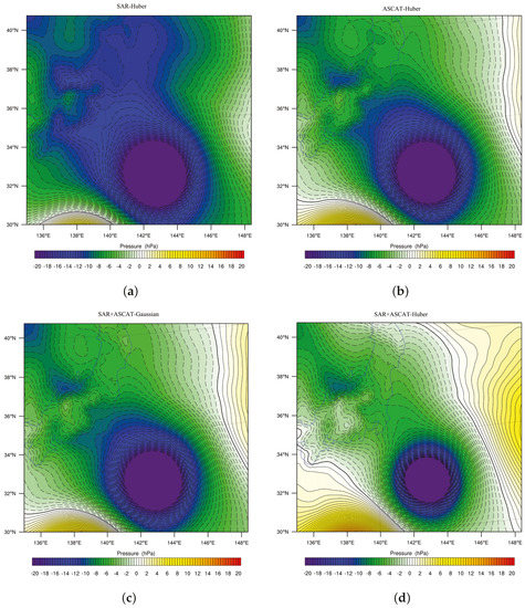 Pressure error of the center area of typhoon Lionrock at the analysis time: (a) assimilation of SAR wind using the Huber norm distribution QC; (b) assimilation of ASCAT wind using the Huber norm distribution QC; (c) assimilation of joint wind using the Gaussian distribution QC; (d) assimilation of joint wind using the Huber norm distribution QC.