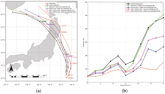 The intensity forecasts of the typhoon based on the different schemes are compared in Figure 10, and Table 2 gives the quantitative analysis of the data assimilation experiments. As shown in the figure, the assimilation of wind data improves the intensity forecast of the typhoon. The joint wind assimilation using the Huber norm, however, in some way weakens the minimum pressure and strengthens the maximum wind speed of the typhoon eye at the time of the assimilation. Although there is a bigger misfit between the intensity forecast and the observed truth than other experiments at the analysis time, it has a better analysis field than the others (see Figure 8). As can be seen from Table 2, the joint assimilation of SAR and ASCAT wind using the Huber norm distribution QC has the minimum average errors on track forecast (85.24 km) and intensity forecast (−5.61 m·s for speed and −1.84 hPa for pressure, respectively). Therefore, the joint wind assimilation using the Huber norm distribution QC has also improved the intensity forecast of the typhoon.