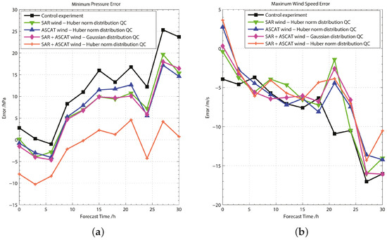 Intensity forecast errors of the typhoon eye: (a) minimum pressure forecast errors. (b) maximum wind speed forecast errors.