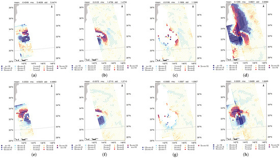 Observation residual after assimilation, where x represents the magnitude of the residual (): (a) residual of the u component of SAR wind using the Huber norm distribution QC; (b) residual of the u component of ASCAT wind using the Huber norm distribution QC; (c) residual of the u component of joint wind using the Gaussian distribution QC; (d) residual of the u component of joint wind using the Huber norm distribution QC; (e) residual of the v component of SAR wind using the Huber norm distribution QC; (f) residual of the v component of ASCAT wind using the Huber norm distribution QC; (g) residual of the v component of joint wind using the Gaussian distribution QC; (h) residual of the v component of joint wind using the Huber norm distribution QC.