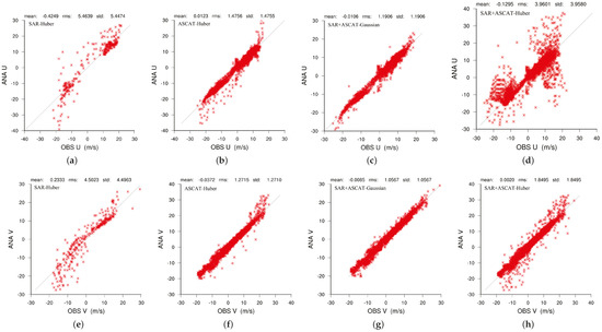 (observation / analysis) comparison of the bias, root-mean-square value and standard derivation of the u and v wind components: (a) u component of SAR wind using the Huber norm distribution QC; (b) u component of ASCAT wind using the Huber norm distribution QC; (c) u component of joint wind using the Gaussian distribution QC; (d) u component of joint wind using the Huber norm distribution QC; (e) v component of SAR wind using the Huber norm distribution QC; (f) v component of ASCAT wind using the Huber norm distribution QC; (g) v component of joint wind using the Gaussian distribution QC; (h) v component of joint wind using the Huber norm distribution QC.