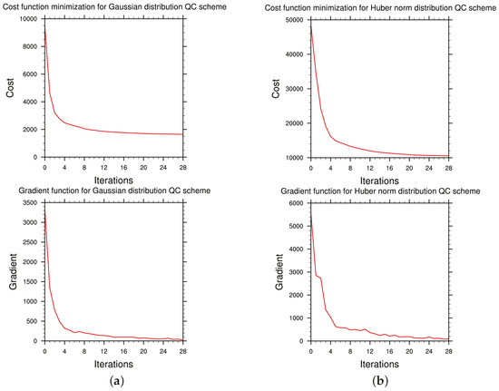 Minimization process of the cost function and the gradient for assimilation of the joint wind field: (a) Gaussian distribution QC scheme; (b) Huber norm distribution QC scheme.