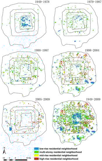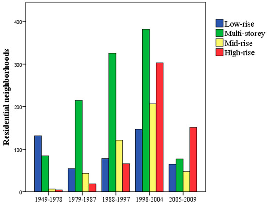The vertical structure of the residential neighborhoods changed greatly through time from 1949–2009 (Figure 3 and Figure 6). Most of the residential neighborhoods built before 1979 were low-rise residential neighborhoods with buildings of no more than 3 floors. There were few residential neighborhoods having buildings with more than 6 floors. The percentage of mid-rise and high-rise residential neighborhoods was only 4.5% during that time period. The residential neighborhoods built from 1979–2004 were dominated by buildings with 4–6 floors, particularly in the early years. For example, 64.8% of the buildings had 4–6 floors. Meanwhile, the proportion of high-rise buildings continued to increase, from only 5.7% in 1979–1988 to 11.2% in 1989–1997, and 29.2% in 1998–2004. During 2005–2009, high-rise apartments became the dominant building type in the residential neighborhoods, accounting for 44.4%. As discussed above, the residential neighborhoods mostly expanded outwards. Consequently, the vertical structure of the residential landscape was gradually built into a “low in the center, high at the edge” form. That is, the low-rise residential neighborhoods with a relatively long history within the 2nd ring road were surrounded by medium- and high-rise residential neighborhoods distributed between the 3rd and 5th ring road in Beijing (Figure 3).