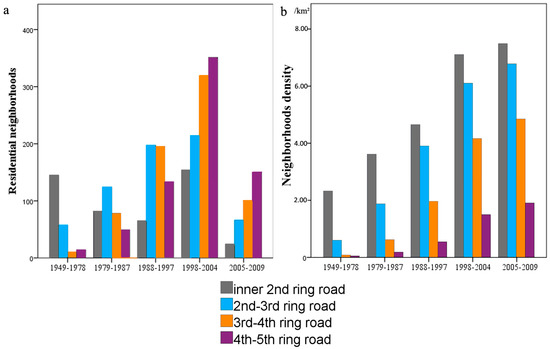 The expansion of the residential neighborhoods was dominated by outward growth, with much less within-city infilling development (Figure 3 and Figure 4). More than 60% of the residential neighborhoods built before 1978 were located in the urban core areas within the 2nd ring road. The residential neighborhoods built during the time period of 1979–1987 mostly occurred between the 2nd and 3rd ring road, with a percentage of 37.3%. From 1988–1997, newly built residential neighborhoods expanded outwards and were mainly located in areas between the 2nd and 3rd ring road and the 3rd ring and 4th ring road, with percentages of 33.4% and 33.1%, respectively. The residential neighborhoods expanded continuously outwards, with new neighborhoods mostly in the locations between the 4th and 5th ring road during the time period of 1998–2009. The proportion of newly built residential neighborhoods located between the 4th and 5th ring road was 33.8% in 1998–2004, and 44.1% in 2005–2009. While the development of the residential neighborhoods mainly tended to expand outwards, within-city infilling development increased through time, particularly in recent years. For example, more than 40% of the residential neighborhoods located in the area between the 2nd and 3rd ring road were built during 1998–2009 (Figure 3 and Figure 4a).