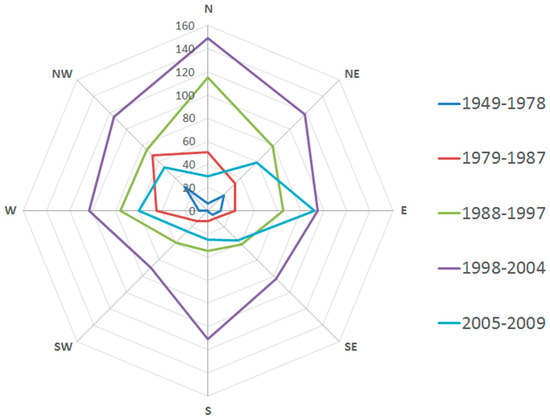 The spatial distribution of the residential neighborhoods is heterogeneous and varied by time. The majority of the residential neighborhoods is located in the northern and eastern region of Beijing, with much less in the southern part (Figure 5). The residential neighborhoods built before 1979 are mainly located in the urban center area (64.2%). Approximately 41% of the residential neighborhoods built during 1979–1987 are located in the western and northwestern part of Beijing. The residential neighborhoods expanded towards the northern (21.9%) and northeastern (15.0%) part during 1988–1997. During 1998–2004, the residential neighborhoods expanded notably in all directions. An increased number of residential neighborhoods was built in the southern part (13.6%), but still less than that in the northern (17.7%) and northeastern (14.0%) regions of Beijing. Most of the residential neighborhoods built during 2005–2009 are located in the eastern region of Beijing (24.2%). Overall, the development of the residential neighborhoods in Beijing shifted from west to north in a clockwise direction (Figure 5). This dramatic increase in the residential neighborhoods in all directions might be related to the housing policies in this time period, during which another round of housing institution reform was implemented (Table 1).