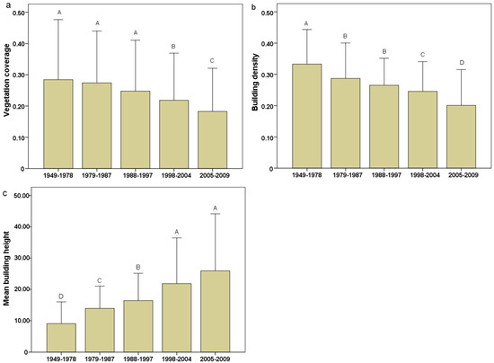 Results of one-way ANOVA on (a) vegetation coverage, (b) building density and (c) building height among different time periods. Superscripted letters indicate a significant difference among different time periods (p < 0.05). Different letters indicate significant differences, and the same letters indicate no significant difference.