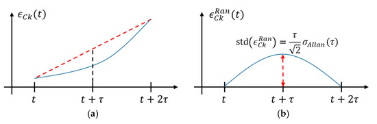 Clock drift error is shown schematically: (a) along with its linear component represented by dashed line and (b) with its linear component subtracted, yielding the random component , which has a maximum deviation within a time interval bounded by .