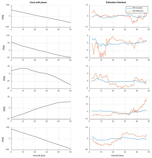 Clock drift estimations were performed over a region of 500 m × 50 km (range × azimuth) using the two methods described in Section 3. For the MS inversion, 40 non-overlapping sub-bands dividing the azimuth bandwidth were processed, while for the MS difference, two non-overlapping sub-bands were processed. Both methods were able to accurately estimate the clock drift phase, with MS inversion yielding a lower Root-Mean-Square (RMS) error and more consistent results compared to MS difference (see Table 3). Simulation results are summarized in Figure 3, Figure 4 and Figure 5.