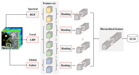 The proposed based HSI classification method can be divided into three steps: (1) multiple features extraction; (2) hashing based hierarchical feature representation and (3) ELM based classification. The flowchart of the proposed method is shown in Figure 1.