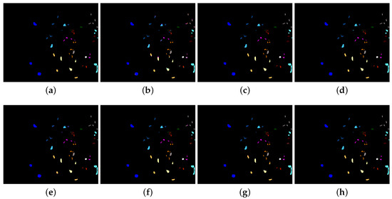 Classification maps by compared methods for GRSS_DFC_2014 data set. (a) the ground truth; (b) GE; (c) LGE; (d) EPF; (e) IIDF; (f) RVCANet; (g) HiFi; (h) .