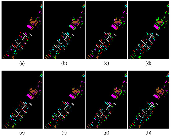 Classification results by all the compared methods are shown in Figure 4, Figure 5 and Figure 6 and Table 1, Table 2 and Table 3. Since the is a fusion approach of some spectral and spatial features, we especially chose the methods that use single or combine two features for comparison [32,37,46,47], so as to validate the effectiveness of the proposed fusion strategy.